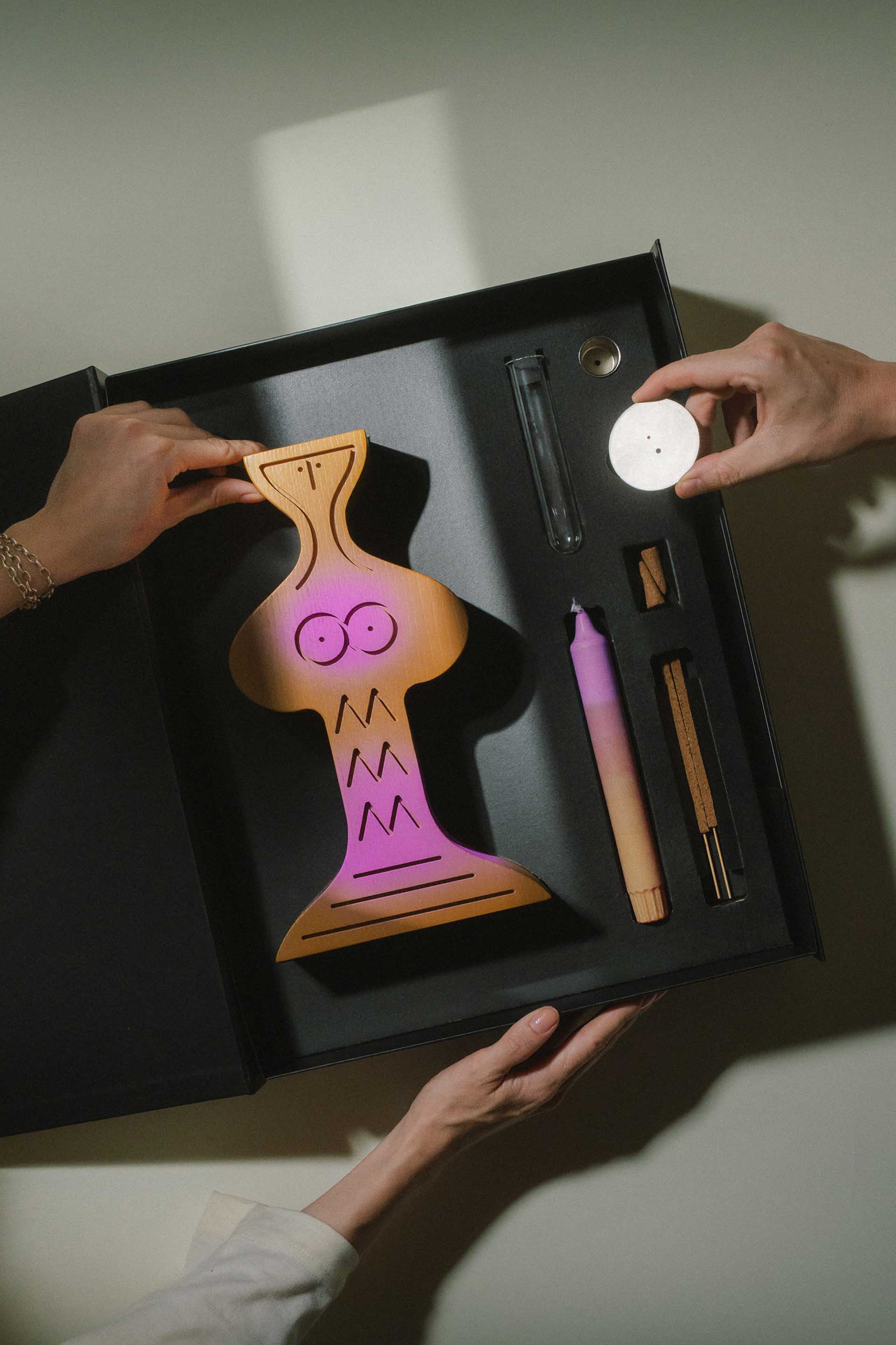 Hand-painted with fluid gradients and geometric Slavic motifs, every figurine is unique, marked by artisanal precision. The set includes a figurine, candle cap, incense holder, glass tube, candle, and both cone and stick incense. LUDISM blends folklore with contemporary design, uniting craft and story, past and present. Designed and made in Poland.