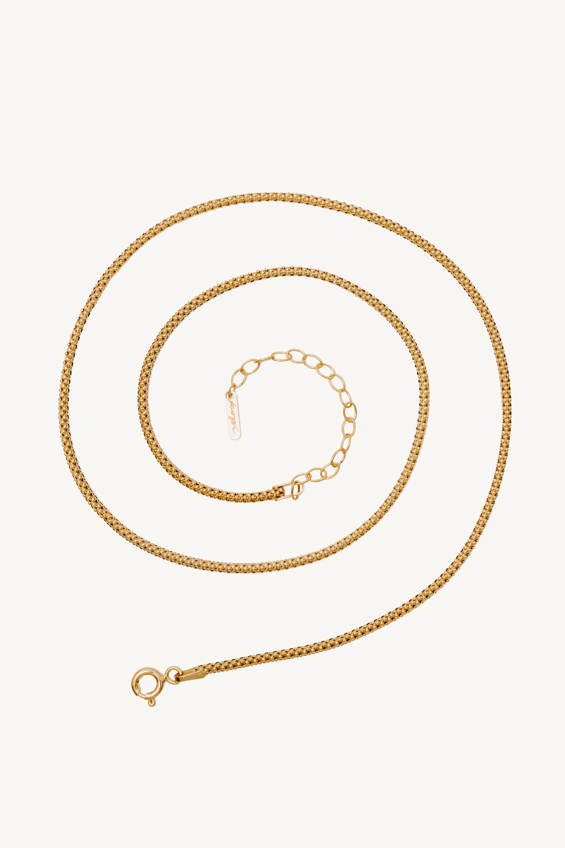 Owalny łańcuszek typu „popcorn”, wykonany z recyklingowanego srebra próby 925 i pozłacany 24-karatowym złotem (1,5 μm). Idealny do przypinania ulubionych zawieszek LUDISM x KOPI za pomocą zapięć.