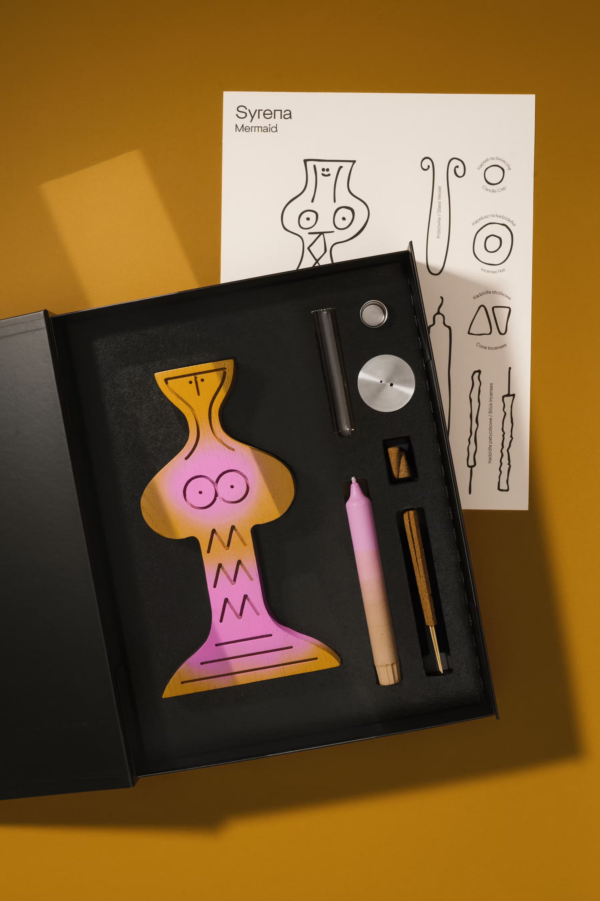 The set consists of: a figurine, a candle cap, an incense holder, a glass test tube, a candle, and two types of incense — cone and stick.