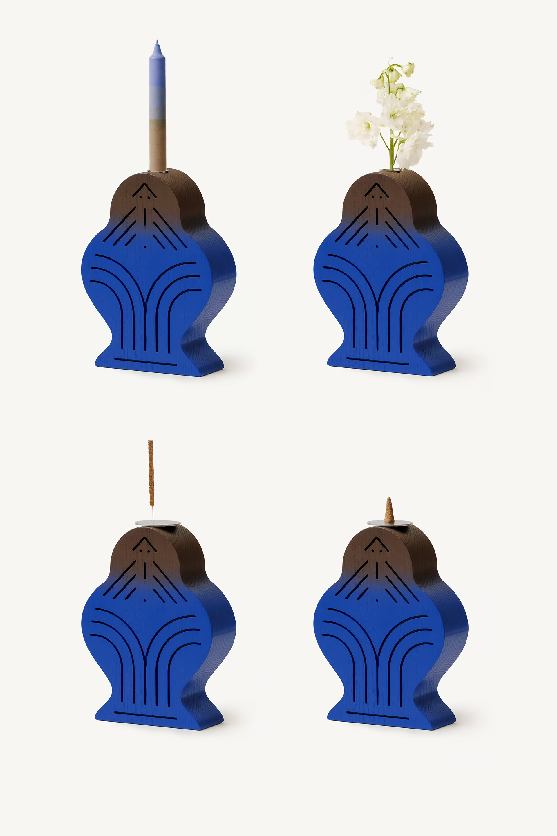 Ash wood figurine that serves as stick-candle holder, vase, incense burner, bookend and artistic object. Each piece is hand painted, therefore unique.